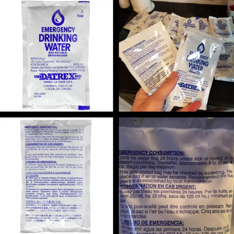Conditionnée en sachet ultra résistant, totalement étanche, et totalement hermétique, une ration d’eau potable d’urgence Emergency Drinking Water peut vous accompagner partout sur terre ou en pleine mer, même en situation engagée. Extrêmement durable, cette eau de survie peut se conserver plusieurs années (environ 5 ans de préférence). Parce que chaque sachet d’eau potable a une contenance bien étudiée de 125 ml, un format passe-partout (15 x 10 x 1,5 cm) et un poids léger (132 grammes), le transport en sac à dos est facilité : un tel sachet d’eau passe n’importe quelle poche ou compartiment de votre sac. Notez qu’une telle ration d’eau potable peut avantageusement être incorporée à un kit de survie. Remarque : cette eau potable de survie a reçu les approbations et certifications du sauvetage en mer, des garde-côtes américains, organismes SOLAS et USCG. Origine : États-Unis.