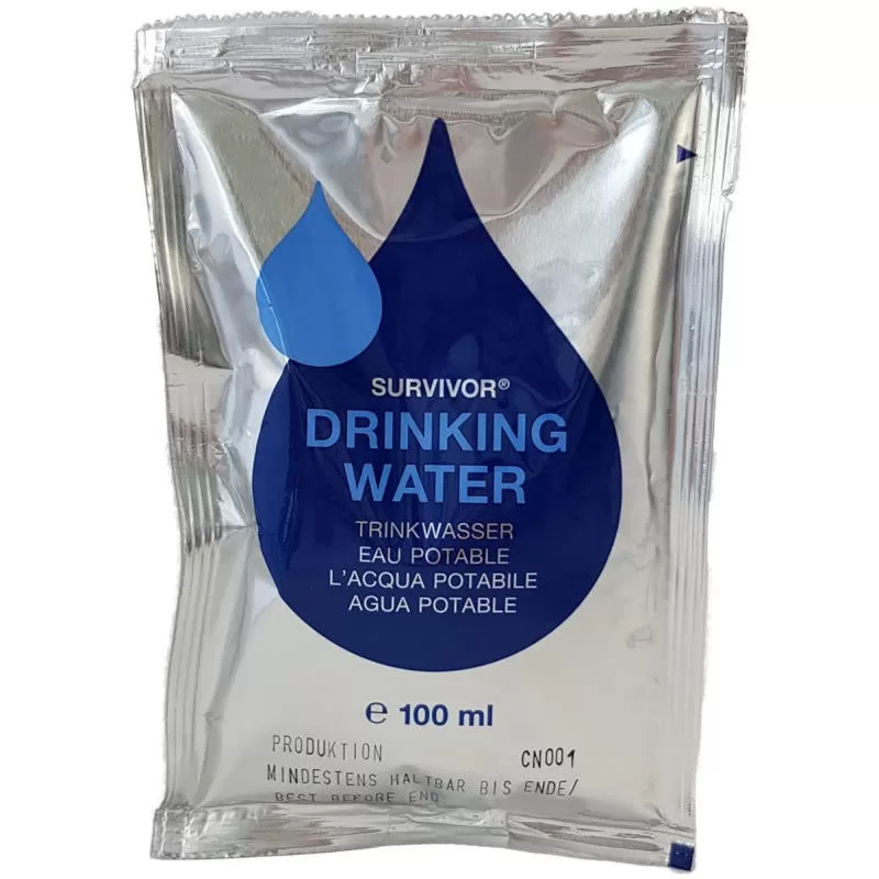 Chaque sachet d’eau potable Survivor Drinking Water comprend une ration d’eau potable à longue durée de conservation. Cette eau est conforme aux normes SOLAS. Parce qu’elle est conditionnée en sachet résistant, hermétique et étanche, on peut la transporter en sac à dos, en bateau et en avion. Elle peut même être stockée dans des températures extrêmes (-50°C à +70°C), sachant qu’elle peut très bien être congelée puis décongelée plusieurs fois sans perdre aucunement son caractère potable : on peut parler de véritable eau de survie. Et chaque sachet d’eau Survivor possède un format avantageux (encombrement réduit) : 14 x 9 x 1,5 cm. Contenance : 100 ml. Poids : 105 grammes.