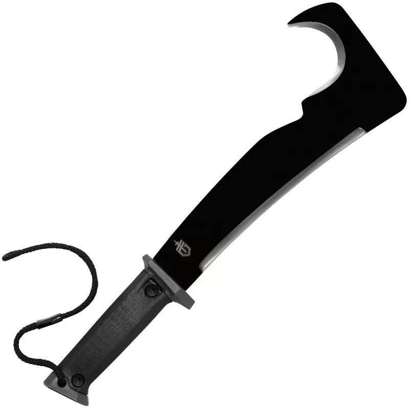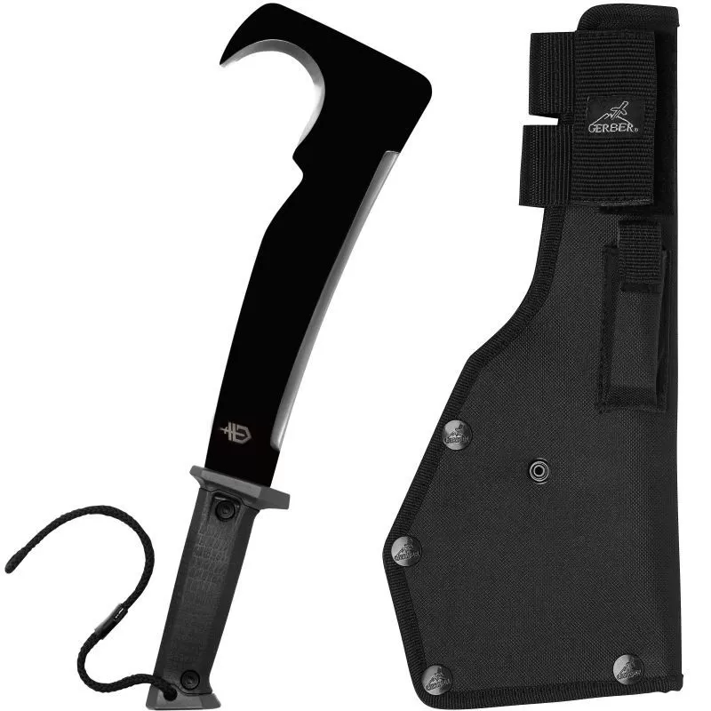 On reconnait la Gator Machete Pro de la marque Gerber au premier coup d’oeil avec sa forme caractéristique qui va au delà de la simple machette. Sa lame acérée de 27 cm et son grand crochet de type serpe en bout de lame lui confèrent une polyvalence étendue. C’est à la fois un coupe-coupe, une hache et un outil capable de creuser, de marteler, de débiter du petit bois pour le feu et de tailler un chemin dans une forêt dense plus rapidement qu’une machette classique. Son poids est de 507 grammes.