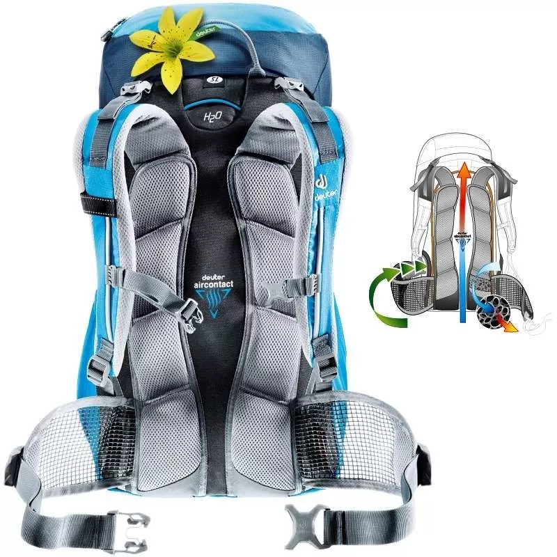 Le modèle ACT Trail Deuter est un sac à dos avec une forme fuselée et sportive. Le côté sportif se ressent jusque dans la ceinture lombaire : cette dernière est escamotable pour gagner en poids ou en mobilité. La version SL (ou version Slim) se traduit par un longueur de dos légèrement raccourcie, des bretelles qui n’appuient pas sur la poitrine et des stabilisateurs plus confortables au niveau des hanches (hanches des femmes et des petits gabarits hommes). La distribution des poches est prévue de la sorte : 2 poches différentes et complémentaires sur les côtés (1 poche zippée à gauche et 1 poche élastique à droite), 2 poches zippées dans le rabat, 1 poche pour la carte et les papiers sur l’avant et bien sûr la poche principale accessible depuis le haut du sac en ouvrant la boucle rapide du rabat (ouverture rapide) ou depuis le bas du sac grâce au zip : on accède à cette poche par le haut ou par le bas suivant les besoins. Une poche à eau de 2 ou 3 litres peut être embarquée : un emplacement spécifique est prévu à cet effet. Au besoin, fixez quelques équipements de randonnée sur le sac à dos : quelques porte-matériels sont à disposition.