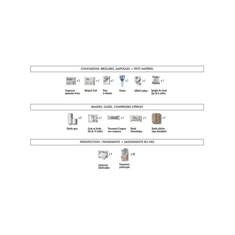 La trousse de secours Compacte signée Pharmavoyage comprend 15 produits de soins d’urgence, de désinfection, de traitement des plaies, saignements et brûlures : un sachet de sutures adhésives, une bande cohésive (type Elastoplast), une paire de gants en vinyle, une pince à échardes, une paire de ciseaux, 6 épingles de sûreté, 2 compresses stériles absorbantes, 1 compresse de glace, 2 compresses apaisantes (Calendula), 2 compresses de chlorhéxidine, 12 pansements prédécoupés, 1 jeu de bandes gaze et 1 rouleau adhésif. En résumé, acheter une trousse de secours Pharmavoyage Compacte, c’est acheter une trousse de soins d’urgence idéale pour désinfecter et traiter les plaies, pour soigner les petites contusions, ecchymoses, brûlures et autres petits accrocs. Elle constitue un élément indispensable parmi votre matériel de randonnée, équipement de trek, bivouac, survie, camping, voyage.